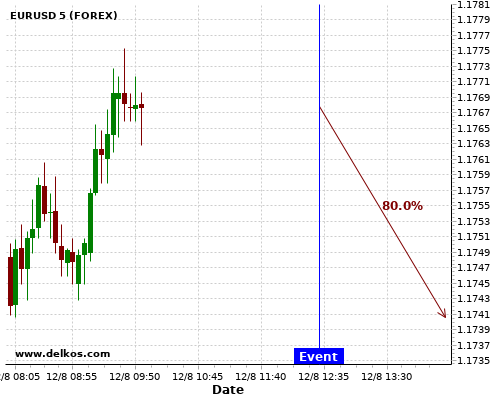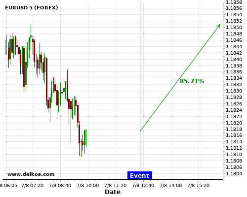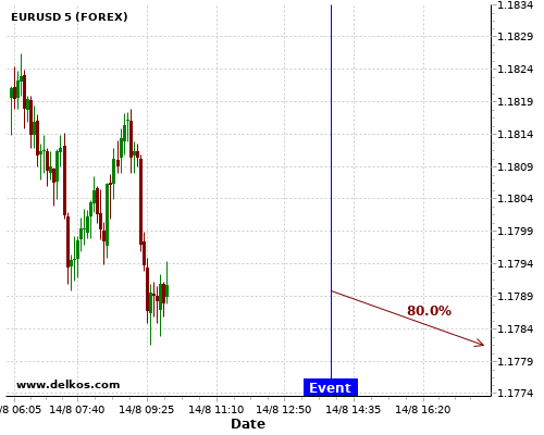DELKOS 80% probability that EURUSD will trend up on Friday 14 Aug at 12:30 PM GMT if the US Retail Sales MoM number is less than 1.9%.