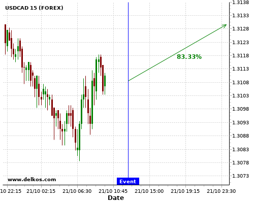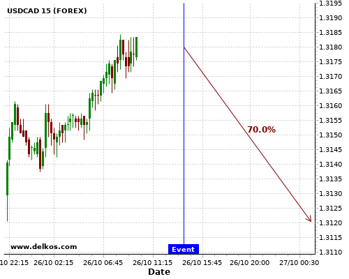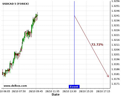 DELKOS 72.72% вероятность того, что USDCAD будет падать Wednesday 28 Oct at 02:00 PM GMT, если показатель CA BoC Interest Rate Decision будет равно 0.25%.