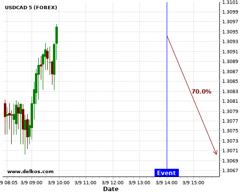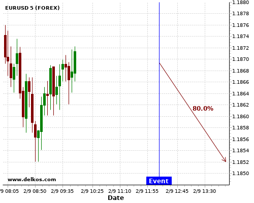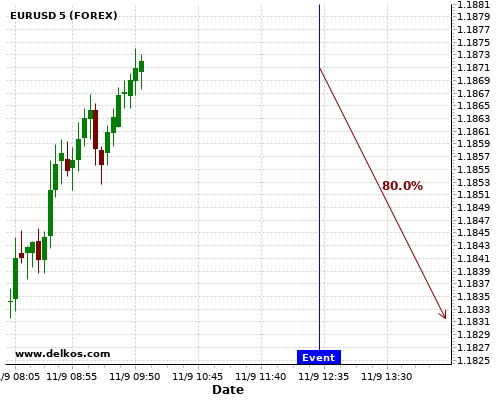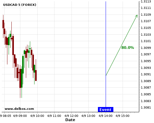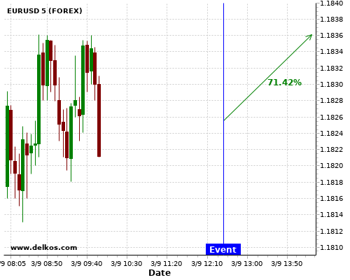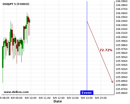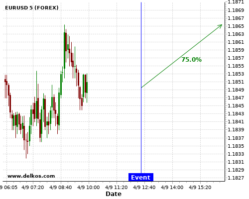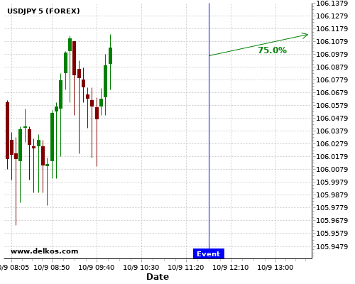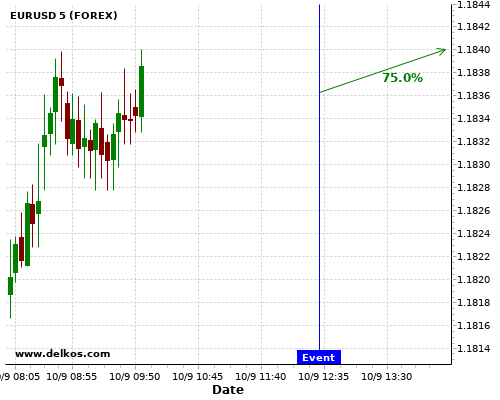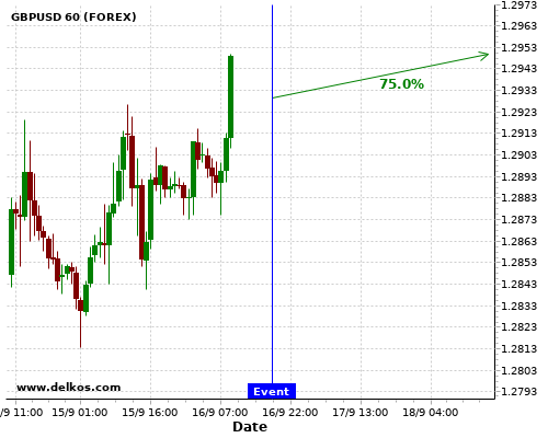 DELKOS 75% вероятность того, что GBPUSD будет расти Wednesday 16 Sep at 06:00 PM GMT, если показатель US Fed Interest Rate Decision будет равно 0.25%.