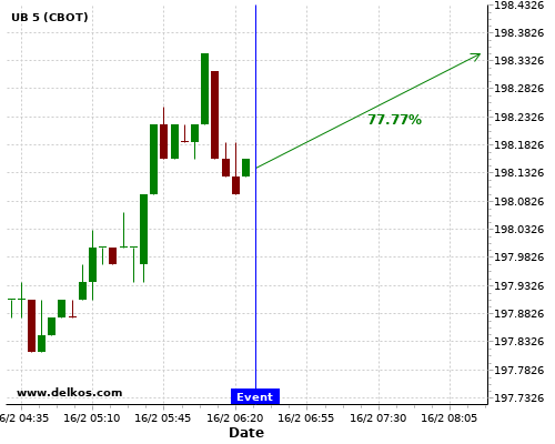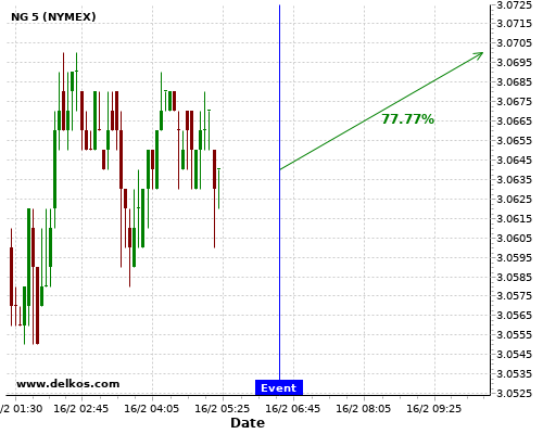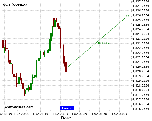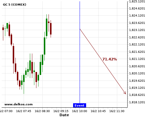 DELKOS 71.42% probability that GC will trend down on Tuesday 16 Feb at 10:00 AM GMT if the DE ZEW Economic Sentiment Index number is greater than 59.6.