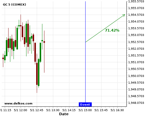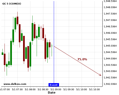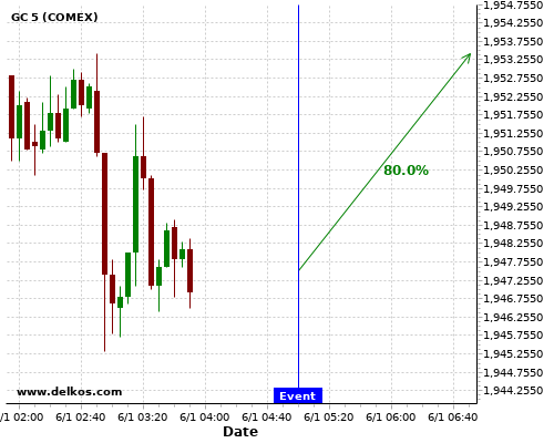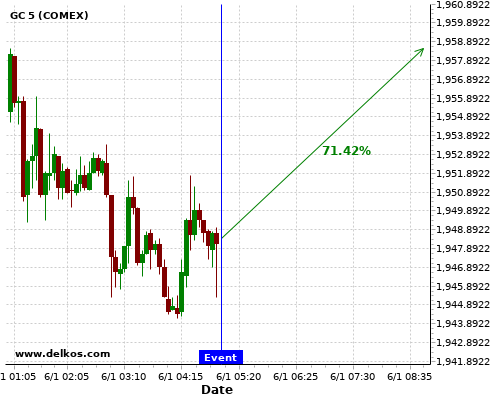 DELKOS 75% probability that GC will trend up on Wednesday 06 Jan at 01:00 PM GMT if the DE Inflation Rate YoY Prel number is less than -0.3%.