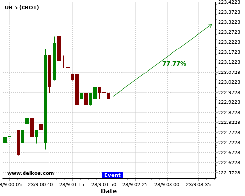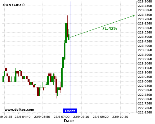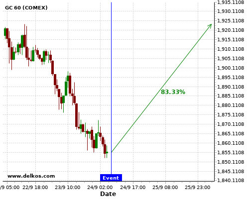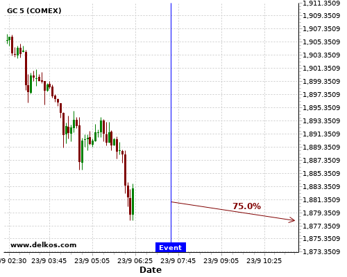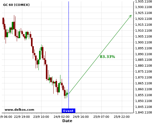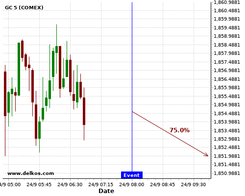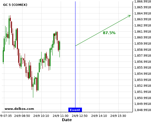 DELKOS 87.5% probability that GC will trend up on Thursday 24 Sep at 12:30 PM GMT if the US Continuing Jobless Claims number is less than 12300K.