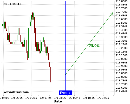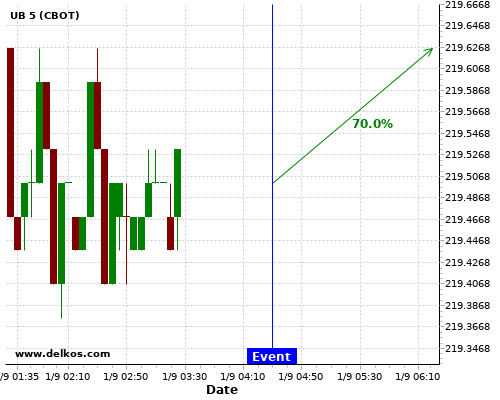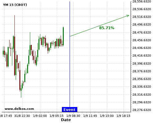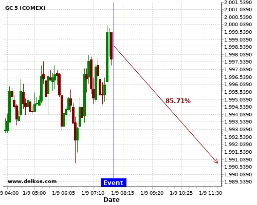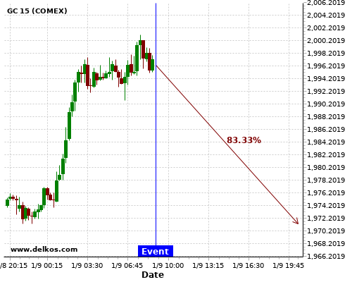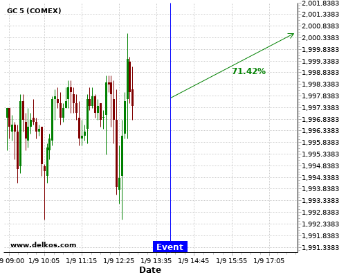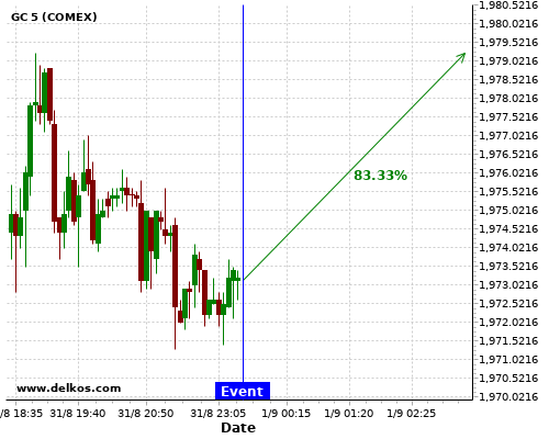 DELKOS 71.42% probability that GC will trend up on Tuesday 01 Sep at 02:00 PM GMT if the US ISM Manufacturing PMI number is less than 54.5.