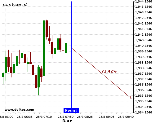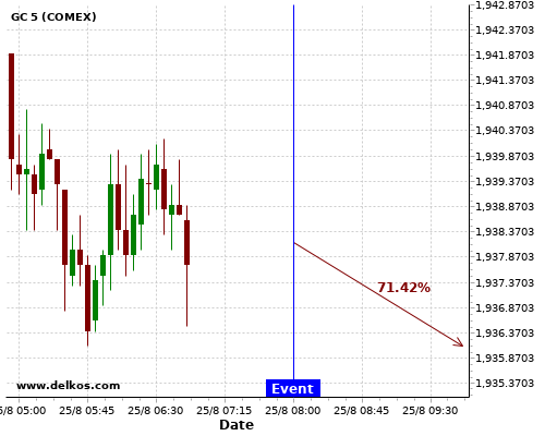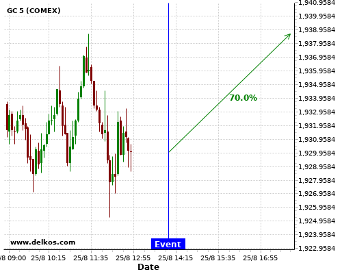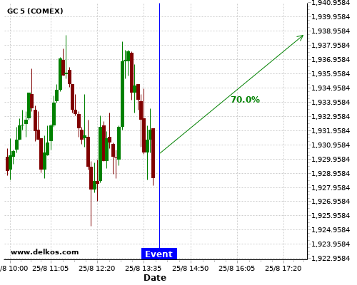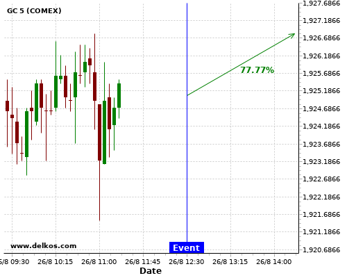 DELKOS 77.77% probability that GC will trend up on Wednesday 26 Aug at 12:30 PM GMT if the US Durable Goods Orders MoM number is greater than 4.3%.