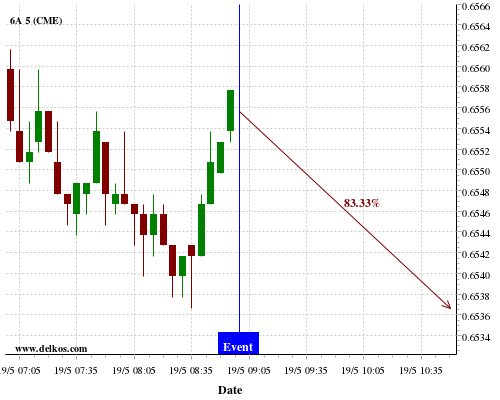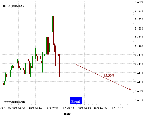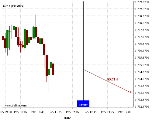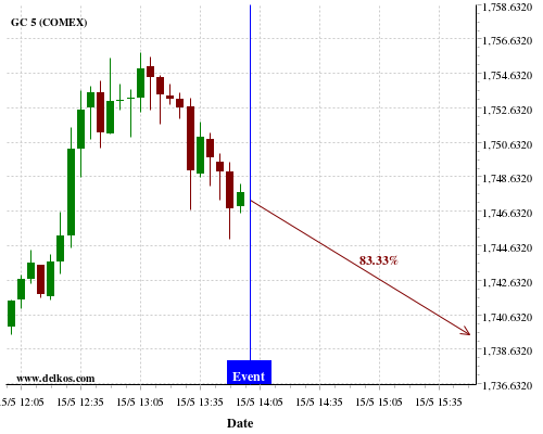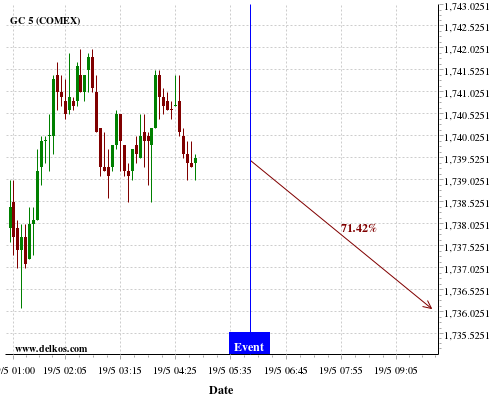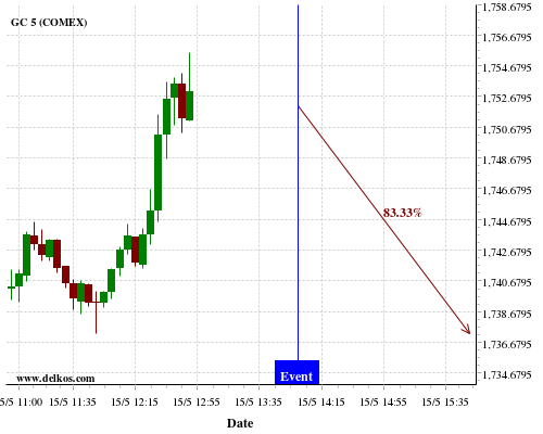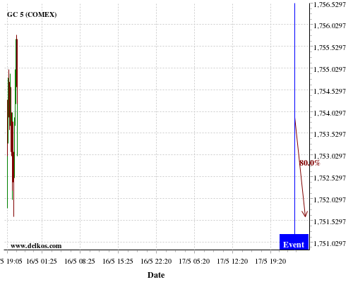 DELKOS 85.71% probability that GC will trend down on Tuesday 19 May at 12:30 PM GMT if the US Housing Starts number is greater than 0.927M.