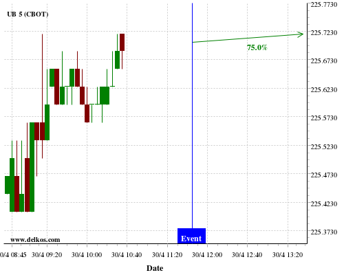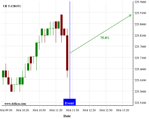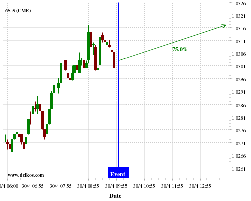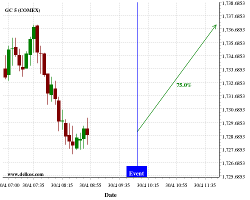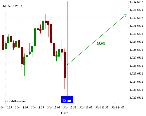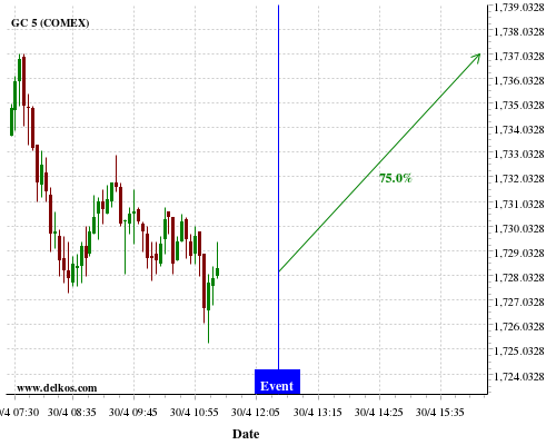 DELKOS 80% probability that GC will trend up on Tuesday 05 May at 12:30 PM GMT if the US Balance of Trade number is greater than $-44B.