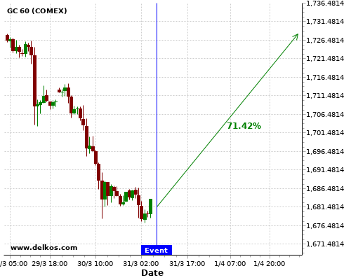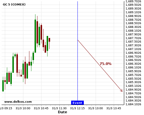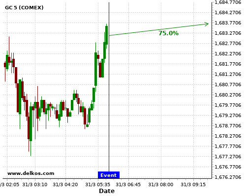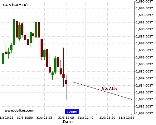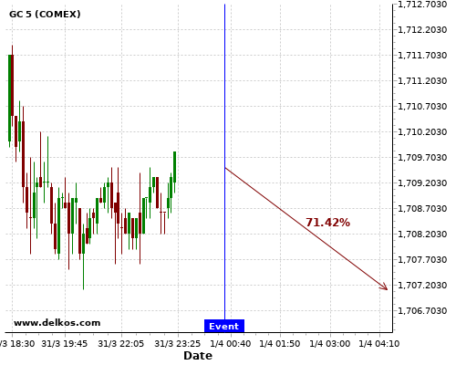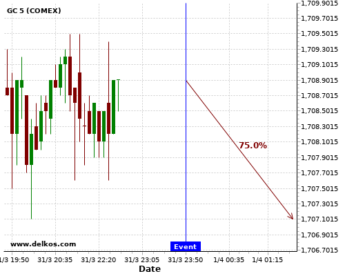 DELKOS 71.42% probability that GC will trend down on Thursday 01 Apr at 12:30 AM GMT if the AU Balance of Trade number is greater than A$9.7B.