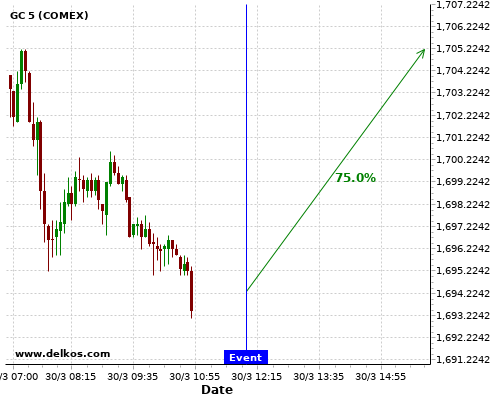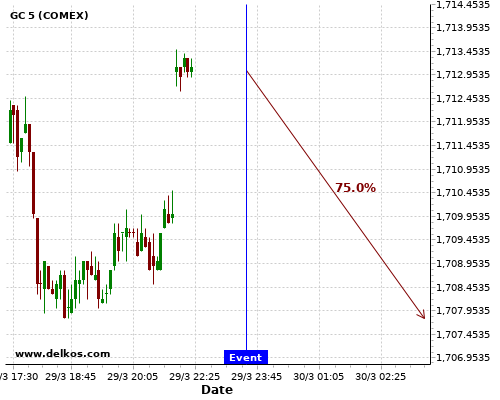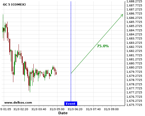 DELKOS 75% probability that GC will trend up on Wednesday 31 Mar at 06:00 AM GMT if the GB GDP Growth Rate QoQ Final number is greater than 1%.
