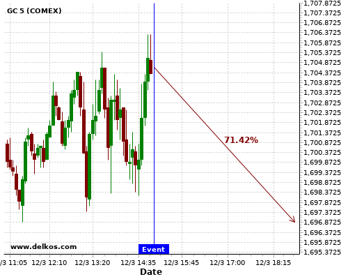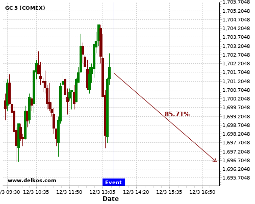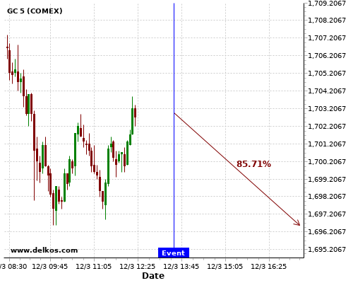 DELKOS 75% probability that GC will trend down on Tuesday 16 Mar at 10:00 AM GMT if the DE ZEW Economic Sentiment Index number is greater than 74.