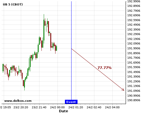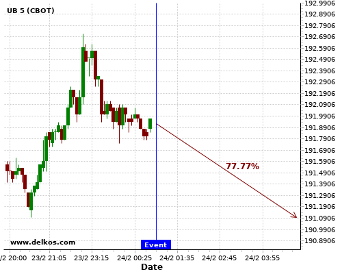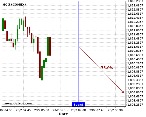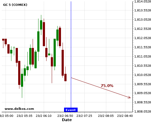 DELKOS 72.72% probability that GC will trend down on Wednesday 24 Feb at 03:00 PM GMT if the US New Home Sales number is greater than 0.855M.