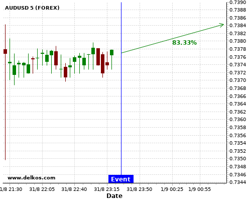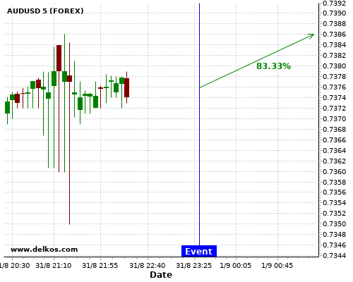 DELKOS ПОСЛЕДНИЕ НОВОСТИ: 83.33% вероятность что AUDUSD будет иметь тенденцию вверх течение следующих нескольких часов.
