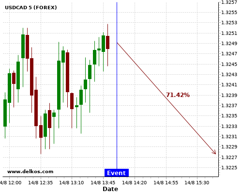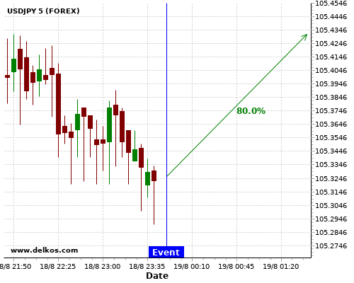 TradersNews 80% probability that USDJPY will trend up on Tuesday 18 Aug at 11:50 PM GMT if the JP Balance of Trade number is greater than ¥-77.6B.