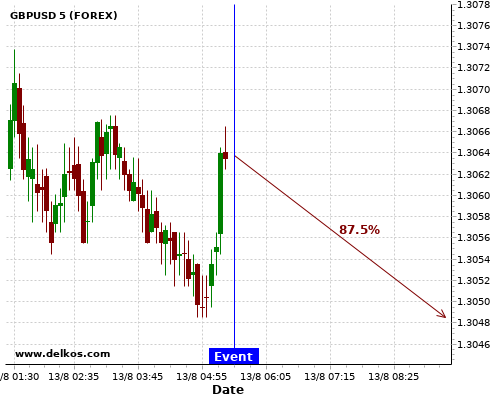 TradersNews 72.72% probability that GBPUSD will trend up on Friday 14 Aug at 09:00 AM GMT if the EMU GDP Growth Rate QoQ 2nd Est number is equal to -12.1%.