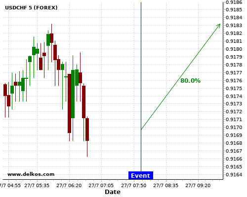 TradersNews 80% probability that USDCHF will trend up on Monday 27 Jul at 08:00 AM GMT if the DE Ifo Business Climate number is less than 89.3.
