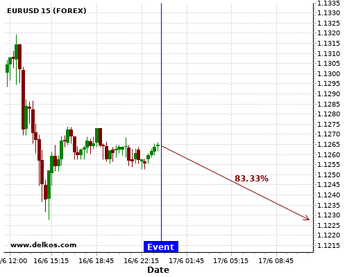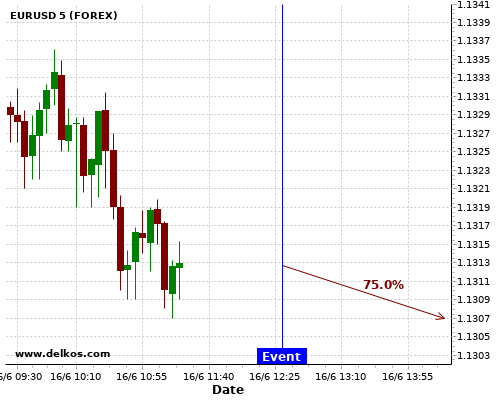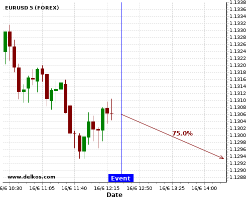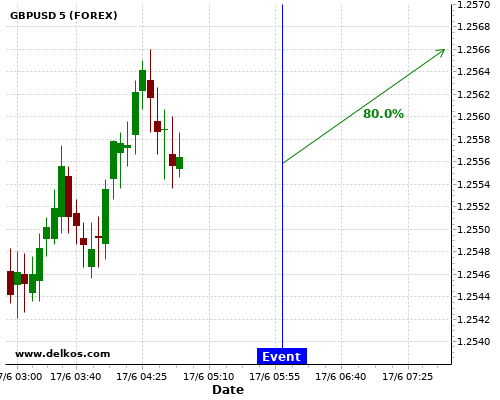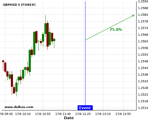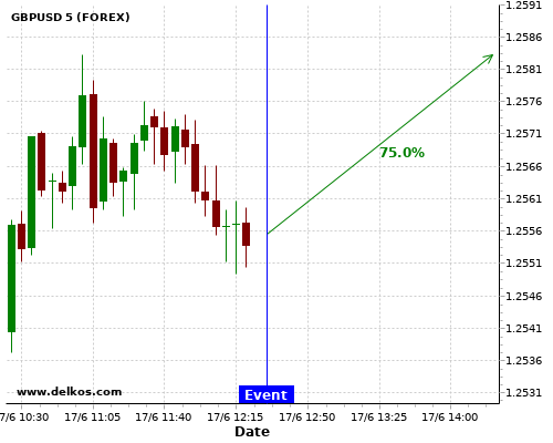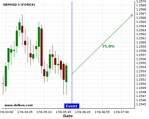 TradersNews 75% probability that GBPUSD will trend up on Wednesday 17 Jun at 12:30 PM GMT if the CA Inflation Rate YoY number is less than 0%.