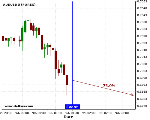 TradersNews 75% probability that AUDUSD will trend down on Tuesday 09 Jun at 01:30 AM GMT if the AU NAB Business Confidence number is greater than -32.