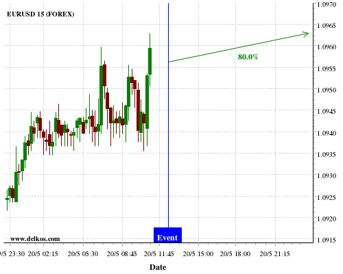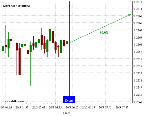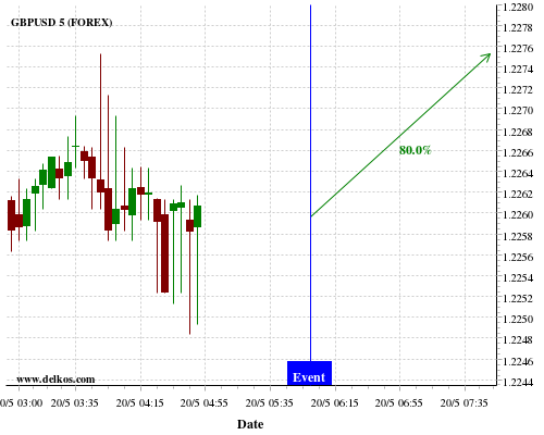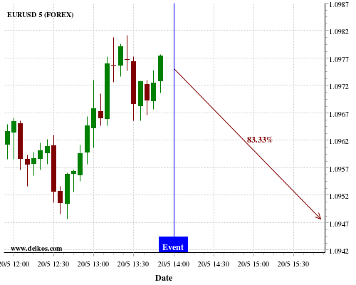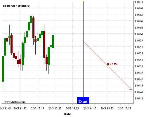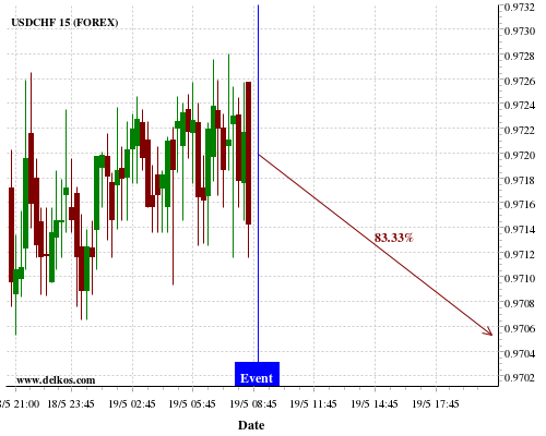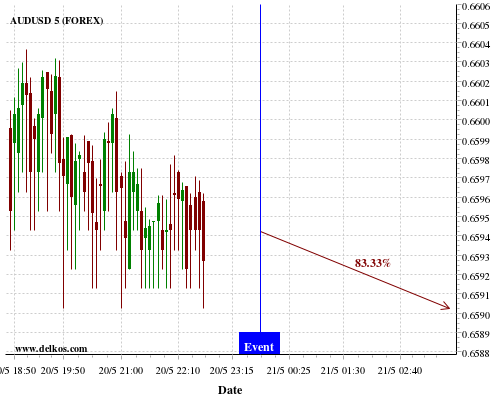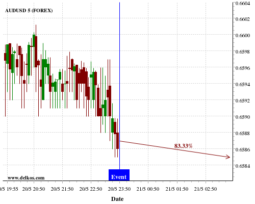 TradersNews 83.33% probability that AUDUSD will trend down on Wednesday 20 May at 11:50 PM GMT if the JP Balance of Trade number is less than ¥-560B.