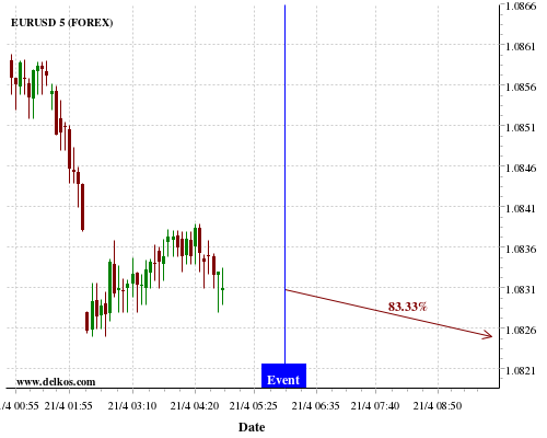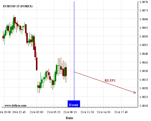 TradersNews 83.33% probability that EURUSD will trend down on Tuesday 21 Apr at 02:00 PM GMT if the US Existing Home Sales number is less than 5.3M.