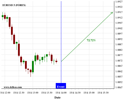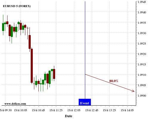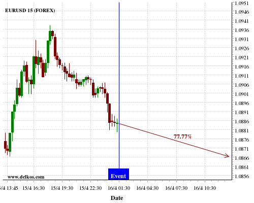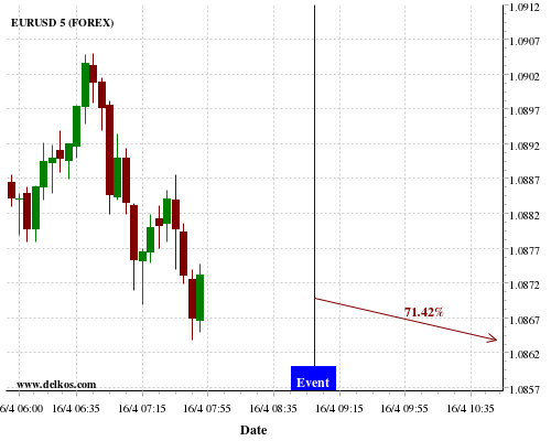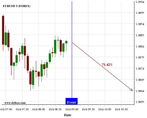 TradersNews 71.42% probability that EURUSD will trend down on Thursday 16 Apr at 09:00 AM GMT if the EMU Industrial Production YoY number is greater than -2%.