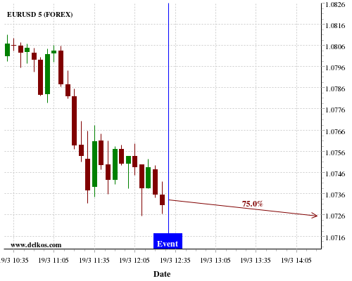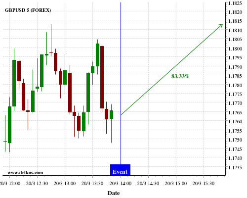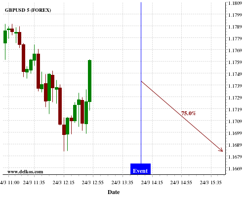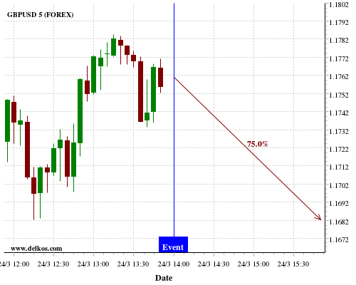 TradersNews 75% probability that GBPUSD will trend down on Tuesday 24 Mar at 02:00 PM GMT if the US New Home Sales number is greater than 0.75M.