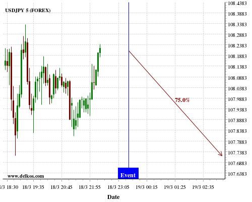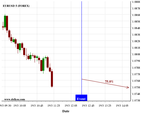 TradersNews 75% probability that EURUSD will trend down on Thursday 19 Mar at 12:30 PM GMT if the US Philadelphia Fed Manufacturing Index number is greater than 10.