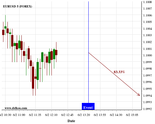 TradersNews 80% probability that EURUSD will trend down on Friday 07 Feb at 03:00 PM GMT if the CA Ivey PMI s.a number is greater than 53.3.
