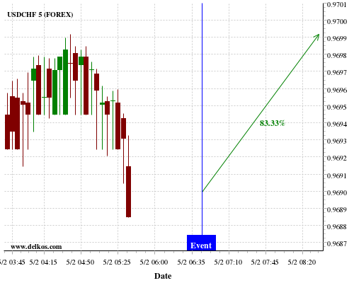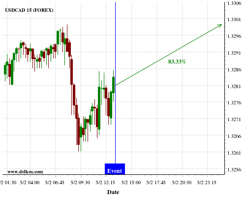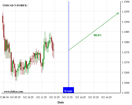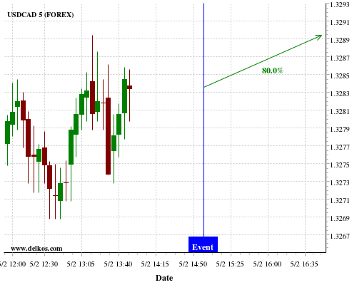 TradersNews 80% probability that USDCAD will trend up on Wednesday 05 Feb at 03:00 PM GMT if the US ISM Non-Manufacturing PMI number is greater than 55.