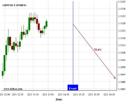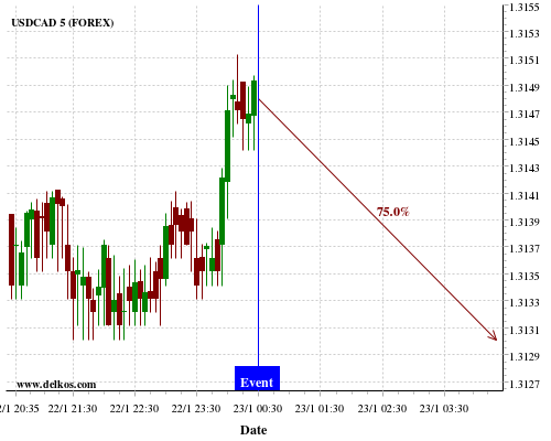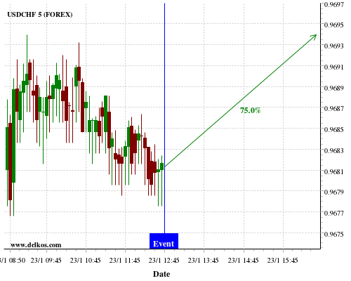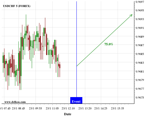 TradersNews 75% probability that USDCHF will trend up on Thursday 23 Jan at 12:45 PM GMT if the EMU ECB Interest Rate Decision number is equal to 0%.
