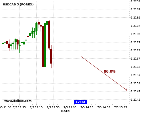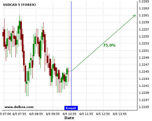 TradersNews 80% probability that USDCAD will trend down on Friday 07 May at 02:00 PM GMT if the CA Ivey PMI s.a number is less than 67.