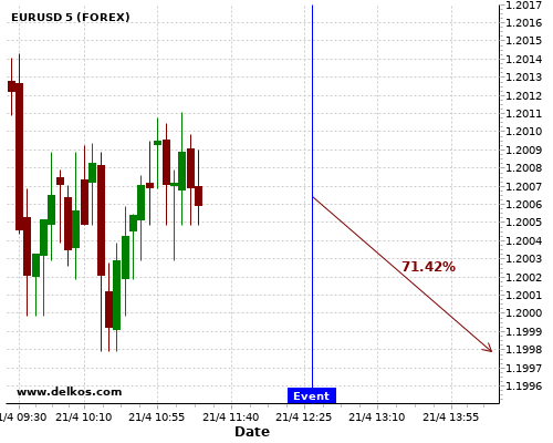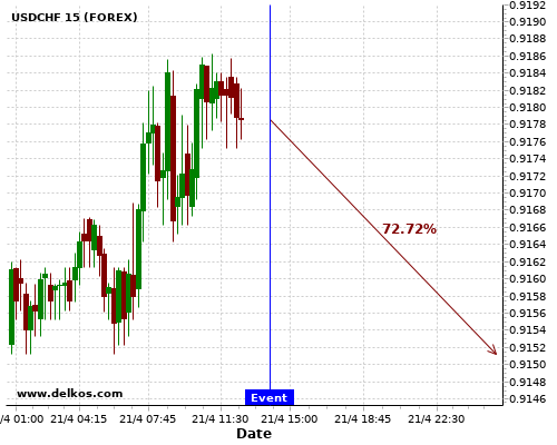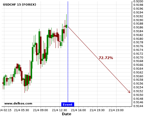 TradersNews 72.72% probability that USDCHF will trend down on Wednesday 21 Apr at 02:00 PM GMT if the CA BoC Interest Rate Decision number is equal to 0.25%.