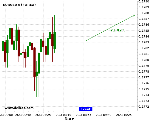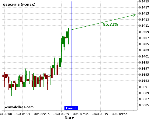 TradersNews 85.71% probability that USDCHF will trend up on Tuesday 30 Mar at 07:00 AM GMT if the CH KOF Leading Indicators number is greater than 104.6.