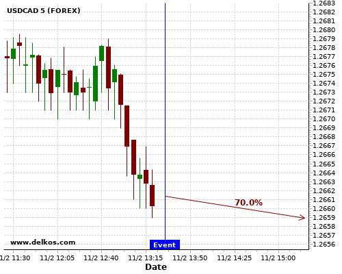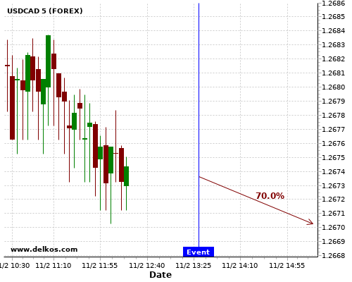 TradersNews 70% probability that USDCAD will trend down on Thursday 11 Feb at 01:30 PM GMT if the US Continuing Jobless Claims number is less than 4490K.