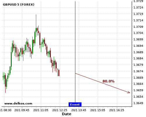 TradersNews 80% probability that GBPUSD will trend down on Wednesday 20 Jan at 01:30 PM GMT if the CA Inflation Rate YoY number is less than 1%.