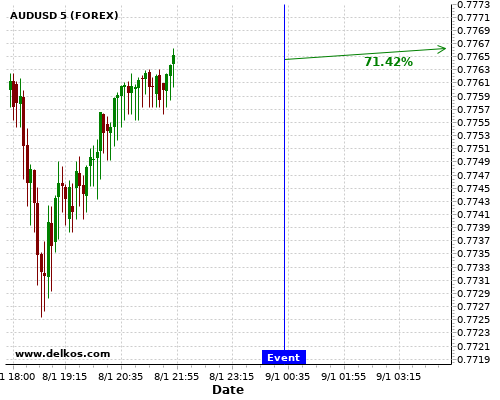 TradersNews 71.42% probability that AUDUSD will trend up on Saturday 09 Jan at 12:30 AM GMT if the AU Balance of Trade number is greater than economists’ expectations.