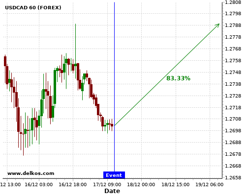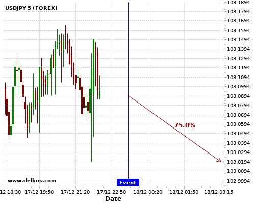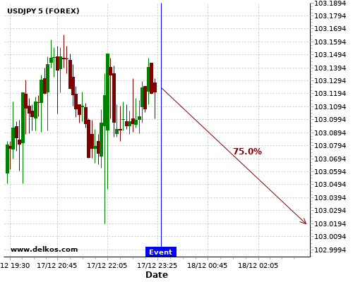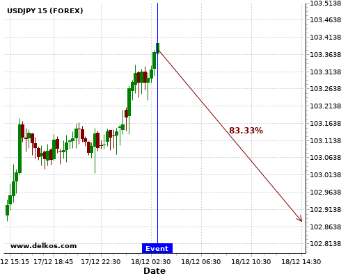 TradersNews 83.33% probability that USDJPY will trend down on Friday 18 Dec at 03:00 AM GMT if the JP BoJ Interest Rate Decision number is equal to -0.1%.
