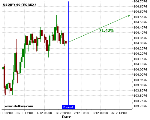 TradersNews 71.42% probability that USDJPY will trend up on Wednesday 02 Dec at 12:30 AM GMT if the AU GDP Growth Rate QoQ number is less than 2.6%.