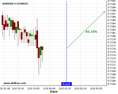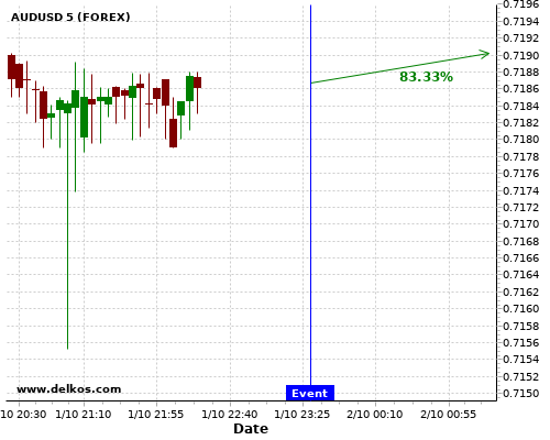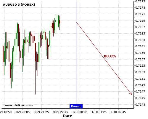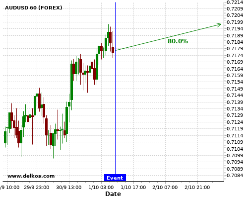 TradersNews 83.33% probability that AUDUSD will trend up on Friday 02 Oct at 01:30 AM GMT if the AU Retail Sales MoM number is greater than -4.2%.