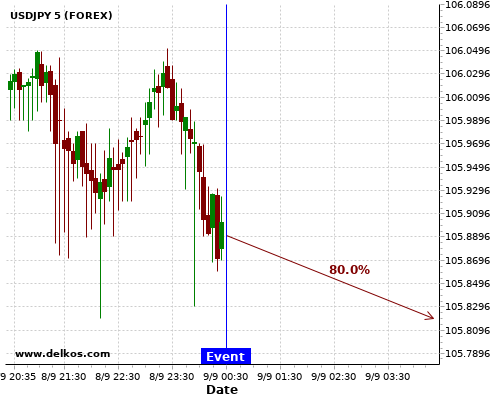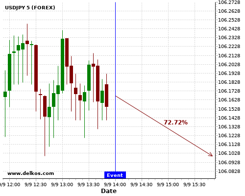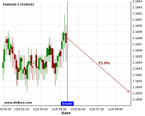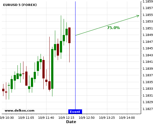 TradersNews 80% probability that EURUSD will trend down on Friday 11 Sep at 12:30 PM GMT if the US Inflation Rate YoY number is less than 1.2%.