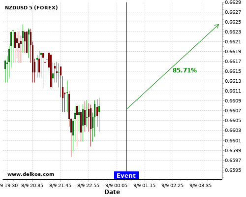 TradersNews 85.71% probability that NZDUSD will trend up on Wednesday 09 Sep at 12:30 AM GMT if the AU Westpac Consumer Confidence Index number is less than 77.