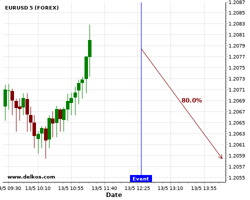 DELKOS 05/14 12:30 PM GMT将公布US Retail Sales MoM的数据如果小于专家预期,EURUSD有71.42%的可能性将下跌。