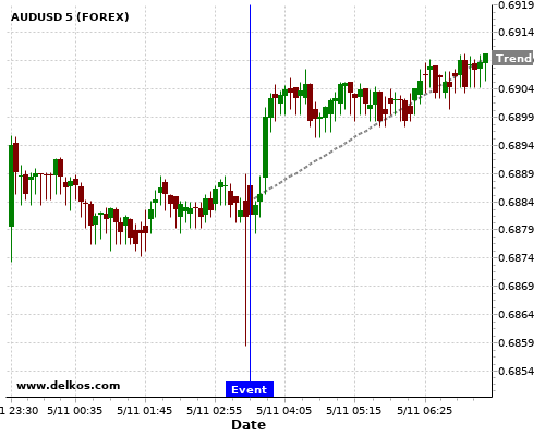 这个概率是根据最近12次公布AU RBA Interest Rate Decision数据得出的, 12次中有11次真实数据等于专家预期, 这其中有8次导致AUDUSD上涨。