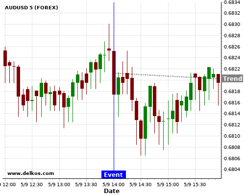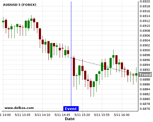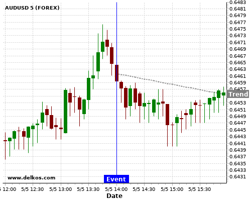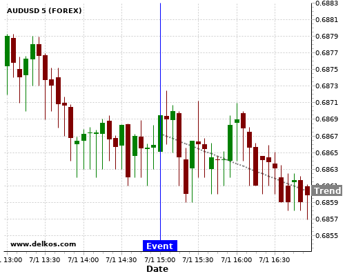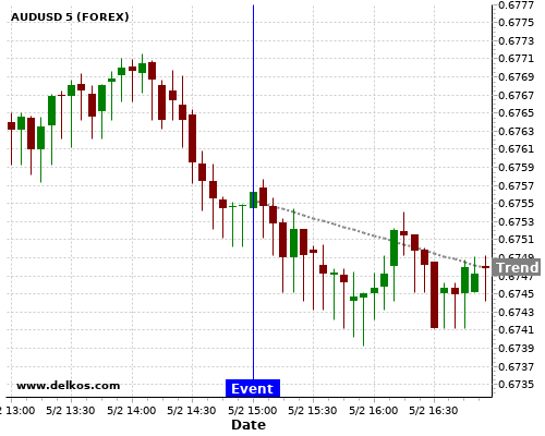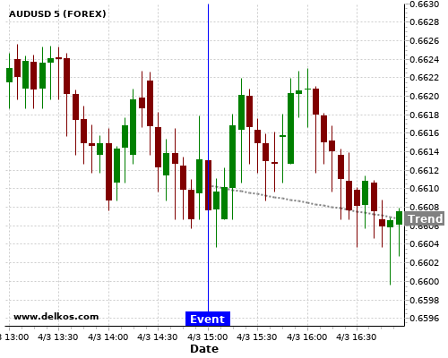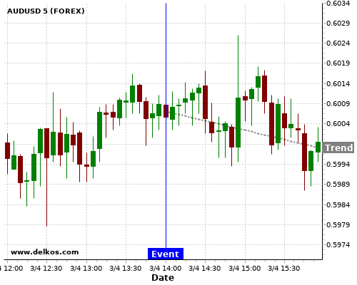 这个概率是根据最近12次公布US ISM Non-Manufacturing PMI数据得出的, 12次中有8次真实数据大于专家预期, 这其中有7次导致AUDUSD下跌。
