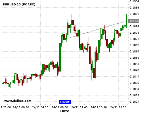 这个概率是根据最近12次公布DE Ifo Business Climate数据得出的, 12次中有7次真实数据大于专家预期, 这其中有5次导致EURUSD上涨。