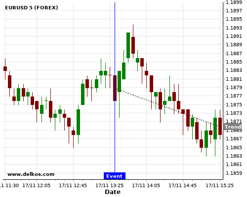 这个概率是根据最近12次公布US Retail Sales MoM数据得出的, 12次中有7次真实数据小于专家预期, 这其中有5次导致EURUSD下跌。