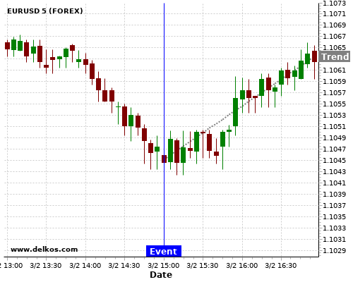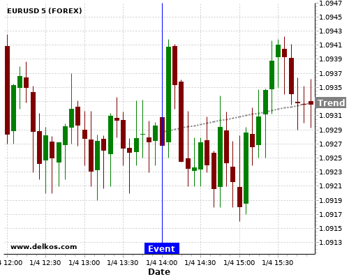 这个概率是根据最近12次公布US ISM Manufacturing PMI数据得出的, 12次中有4次真实数据大于专家预期, 这其中有3次导致EURUSD上涨。