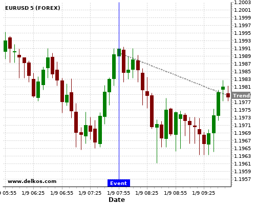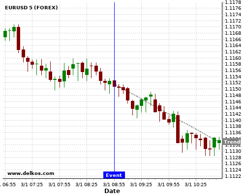 这个概率是根据最近12次公布DE Unemployment Rate数据得出的, 12次中有4次真实数据等于专家预期, 这其中有3次导致EURUSD下跌。