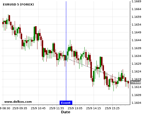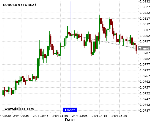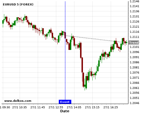 这个概率是根据最近12次公布US Durable Goods Orders MoM数据得出的, 12次中有4次真实数据小于专家预期, 这其中有3次导致EURUSD下跌。