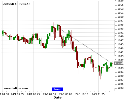 这个概率是根据最近12次公布DE Markit Manufacturing PMI Flash数据得出的, 12次中有9次真实数据大于专家预期, 这其中有7次导致EURUSD下跌。