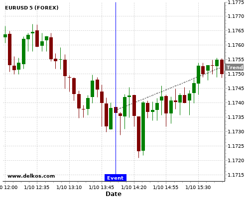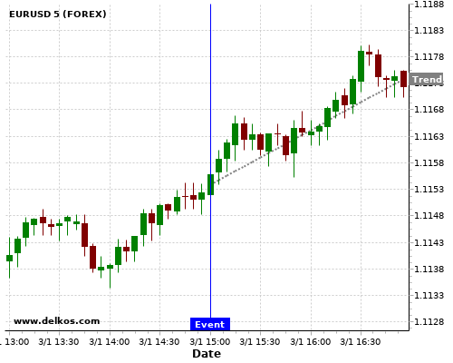 这个概率是根据最近12次公布US ISM Manufacturing PMI数据得出的, 12次中有5次真实数据小于专家预期, 这其中有4次导致EURUSD上涨。
