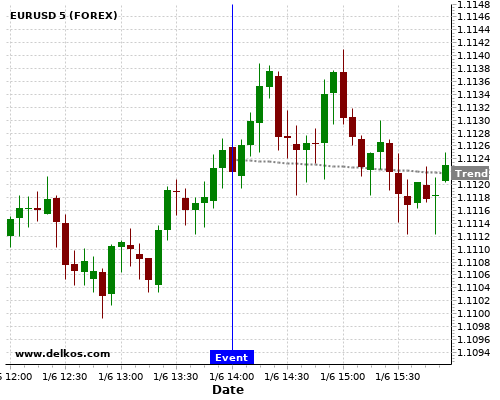 这个概率是根据最近12次公布US ISM Manufacturing PMI数据得出的, 12次中有6次真实数据小于专家预期, 这其中有1次导致EURUSD下跌。